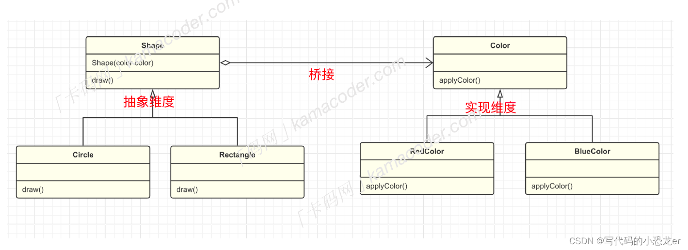 - 具体实现ConcreteImplementor :实现实现化接⼝的具体类。这些类负责实现实现化接⼝定义的具体操作。