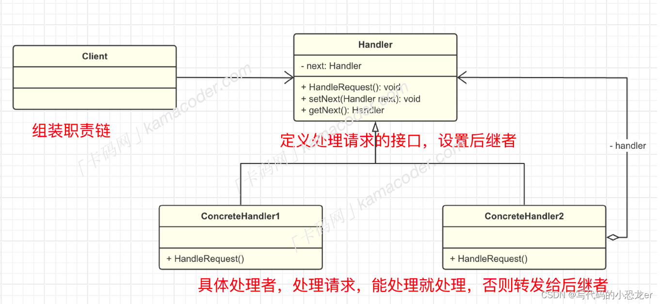 - 1. 处理者Handler :定义⼀个处理请求的接⼝,包含⼀个处理请求的抽象⽅法和⼀个指向下⼀个处理者的链接。