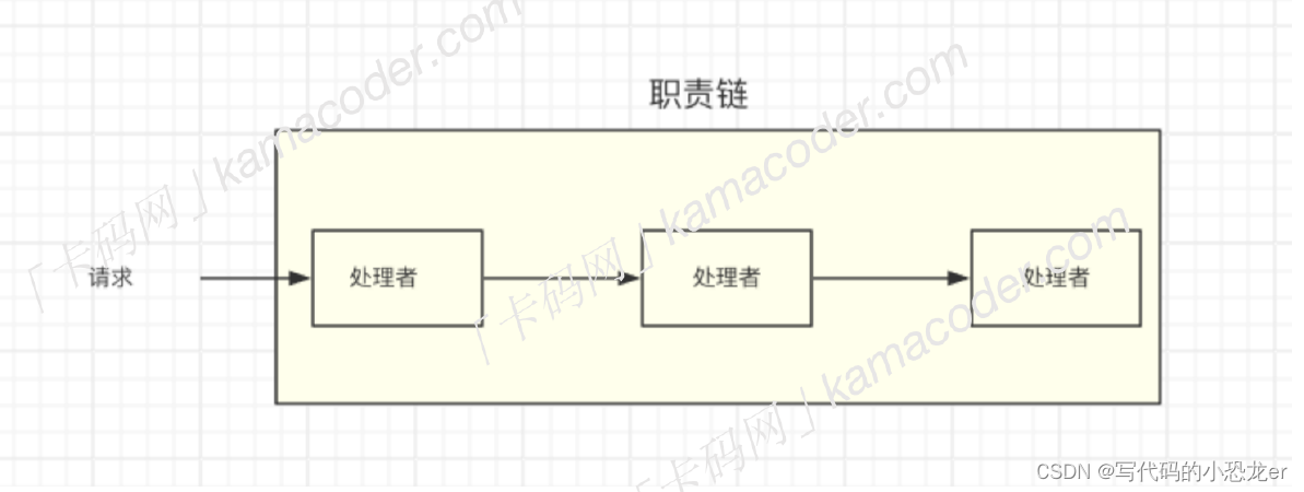 职责链上的处理者就是⼀个对象,可以对请求进⾏处理或者将请求转发给下⼀个节点,这个场景在⽣活中很常⻅,就是⼀个逐层向上递交的过程,最终的请求要么被处理者所处理,要么处理不了,这也因此可能导致请求⽆法被处理。