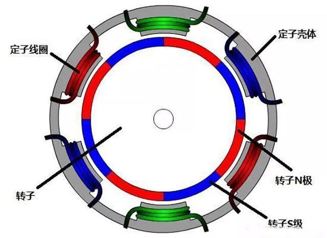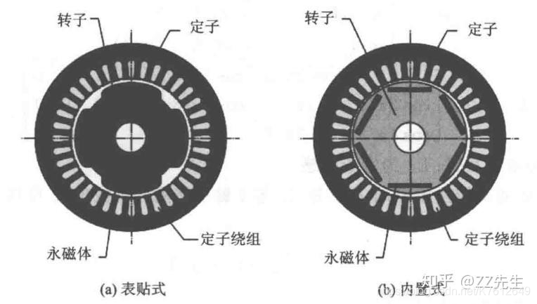 定子绕组为集中绕组,永磁转子形成方波磁场;永磁同步电机的电机本体:定子绕组为分布绕组,永磁转子形成正玄磁场;