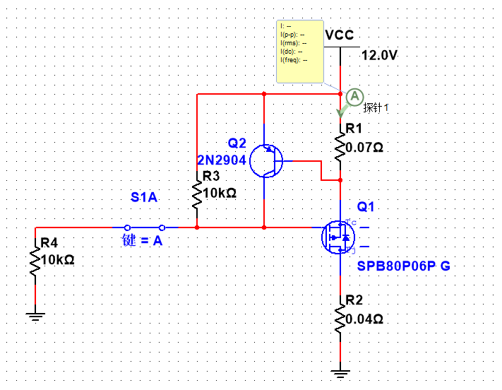 这次我们选用导通压降为-0.7V的PNP三极管,Vbe小于或者等于导通压降。如下图所示,当三极管Q2导通时,MOS管栅极电位被强制拉到12V,此时MOS管关断。因为设置阈值电流为10A,所以选用采用电阻R1的阻值为0.07欧姆。当流过10A电流时,R1上的压降为0.7V,此时三极管Q2的Vbe=-0.7V,三极管导通,MOS管强行关断。图中R2为仿真中的负载电阻。