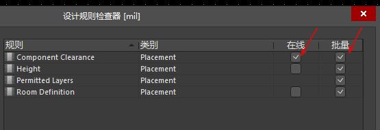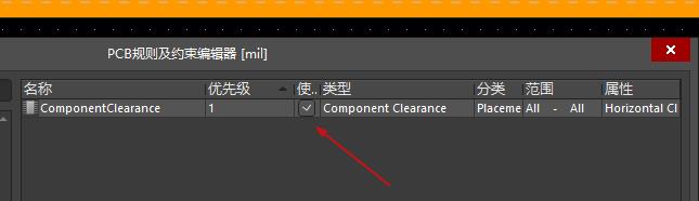 1、首先在设计设计列表中检查设计规则,ComponentClearance有没有使能。如果没有使能需要勾选使能,如下图所示。