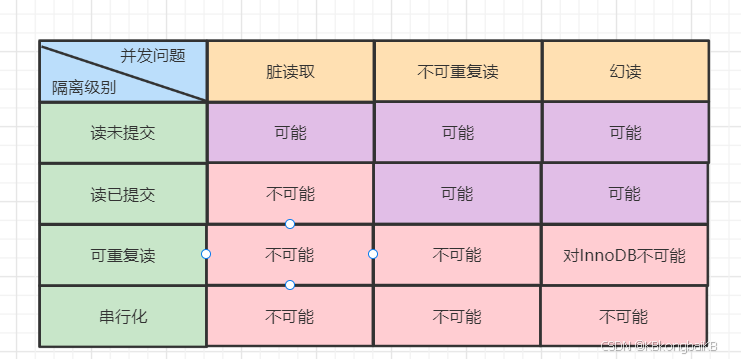事务A和事务B,事务A在操作数据库时,事务B只能排队等待 这种隔离级别很少使用,吞吐量太低,用户体验差 这种级别可以避免“幻像读”,每一次读取的都是数据库中真实存在数据,事务A与事务B串行, 而不并发