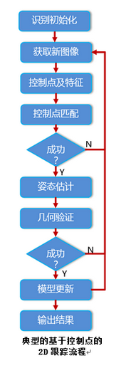 - 控制点法:基于控制点的方法由于其实时高效成为目前业内主流方法。控制点类的方法并不直接对姿态Pt进行寻优,而是通过控制点匹配的方法来计算Pt。控制点法的一个典型流程参见图9。其基本出发点在于使用图像中特别的点(通常是角点)来建立模板R和视频图像It的之间的映射,通过该映射建立方程组,然后求解出姿态Pt。比如说模板是一张人物的相片,那么我们在视频中定位的时候并不需要对于脸上的所有点进行匹配,而可以通过一些控制点(眼角,鼻尖,嘴角等)迅速定位。