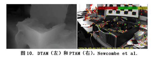 - 稠密SLAM:简单的说,稠密SLAM的目的是对所相机所采集到的所有信息进行三维重建。通俗的说,就是对看见的每一个空间上的点算出它到相机的方位和距离,或者知道它在物理空间的位置。在AR相关的工作里面最近的影响力较大的有DTAM和KinectFusion,前者是纯视觉的,后者则使用了深度相机。由于需要对几乎所有采集到的像素进行方位计算,稠密SLAM的计算量那是杠杠的,所以不是平民AR(比如一般的手机,手握6S/S7/Mate8的朋友不要侧漏傲气,这些统统都算“一般”)。
