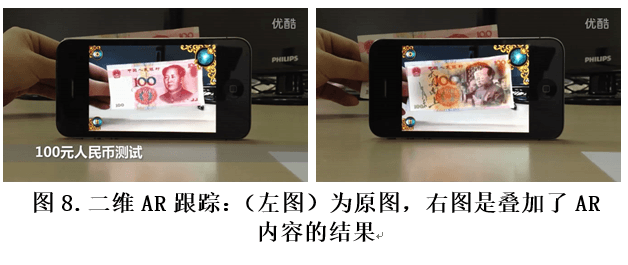 一般情况下, AR中二维平面物体的跟踪可以归结为如下问题:给定一个模板图片R,在视频流中时刻检测该图片的(相对相机的)三维精确位置。比如在下图的例子中,R是实现知道的人民币图片,视频是从手机端实时获取的,通常记为It (表示在时间t获得的视频图像),而需要得到的是R在It 中的几何姿态(通常包括三维旋转和平移),记为Pt。换句话说,模板图片R通过由Pt表示的三维变换就可以被贴到它在图像It中的位置。跟踪结果的用途也很显然,既然知道了这个姿态Pt,我们可以用一个美元的图片以同样的姿态叠加到视频中来替换人民币,从而达到6倍以上的炫富效果。好吧,例子中没有那么俗气,而是叠加了一个庄严的视频。