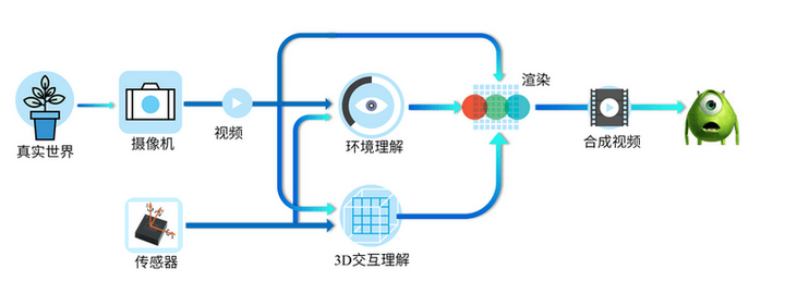 上图描绘了一个典型的AR系统的概念流程。从真实世界出发,经过数字成像,然后系统通过影像数据和传感器数据一起对三维世界进行感知理解,同时得到对三维交互的理解。3D交互理解的目的是告知系统要“增强”的内容。