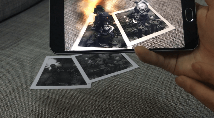 - 二维图片:二维码的非自然人工痕迹很大得局限了它的应用。一个很自然的拓广是使用二维图片,比如纸币、书本海报、相片卡牌等等。聪明的小白朋友一定已经发现:二维码本身也是二维图片,那为啥不把二维码的方法直接用到二维图片上呢?哦,是酱紫:二维码之所以简单就是因为它上面的图案是设计出来的让视觉算法可以迅速的识别定位的,一般的二维图片则不具备这种良好的性质,也需要更强大的算法。并且,不是所有的二维图片都可以用来进行AR定位的。极端情况下,一个纯色的没有任何花纹的图片是无法用视觉的方法定位的。下图例子中,两张卡牌用来定位两个对战重点的虚拟战士。