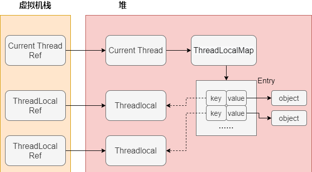 看到Entry继承自 WeakReferencr<ThreadLocal<?>>,就是一个 key-value 形式的对象。它的 key 就是 ThreadLocal 对象,并且是一个弱引用,如果没有指向 key 的强引用后,该 key 就会被垃圾回收器回收;Entry 的 value 就是存储 Object 对象,是强引用。