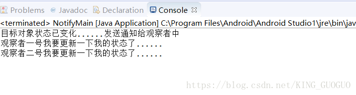 }将两个观察者通过attach添加到观察者集合中,然后由目标来发送一条更新的消息。观察者接收到消息后做出反应。运行结果如下: