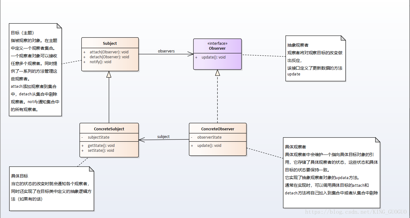 从图中我们可以看到之前说的目标和观察者。只不过这里的目标和观察者都被抽象化了。我们来逐一认识: