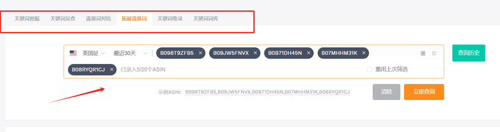 第二步:搭建关键词词库。通过竞品反查,用【关键词反查】/【拓展流量词】获取竞品流量词;以词拓词,在【关键词挖掘】输入核心词拓展相关长尾词;通过 Top 流量词反查,用【出单词反查】抓取头部产品出单词。
