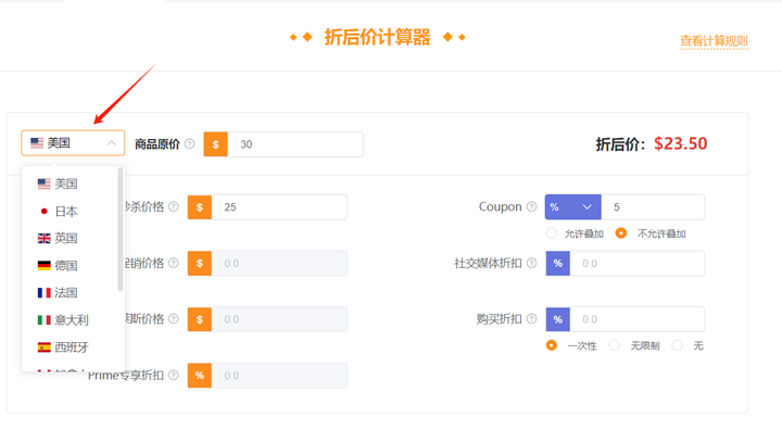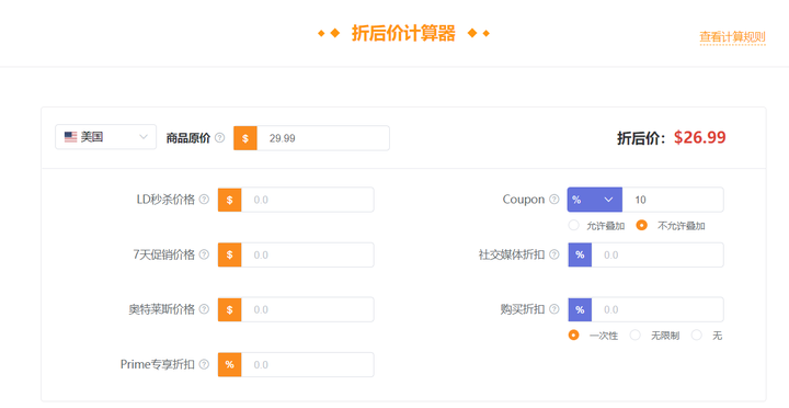 但用折后计算器输入参数后,系统显示正确折后价为 22.99-29.99×8%=20.59 美元。这 0.56 美元的差价看似不多,可活动期间爆了 3000 单,直接导致额外亏损 1680 美元。如果提前用计算器核算,就能避免这场损失。
