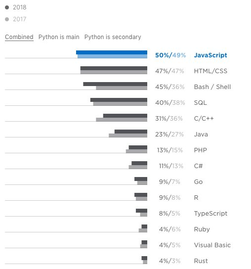 Python 用户中有一半还使用 JavaScript。 2018 年的统计数据与 2017 年的结果非常相似,唯一显著的区别是 Bash / Shell 从 2017 年的 36%增长到 2018 年的 45%。Go 和 SQL 都增长了 2 个百分点,而 C / C ++、Java 和 C#等许多其他语言的占比降低。