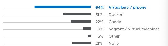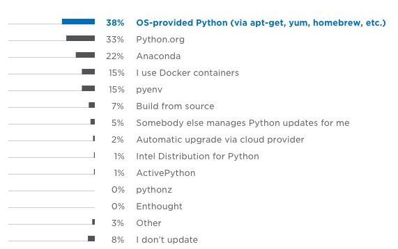 71%的受访者从 python.org 或 OS 提供的包管理器(如 APT 和 Homebrew)安装 Python。这与 2017 年的结果非常相似。有趣的是,与 2017 年相比,Anaconda 的占比增长了 7 个百分点。这更加明确了数据科学比其他类型的开发类型受欢迎程度增长更快。