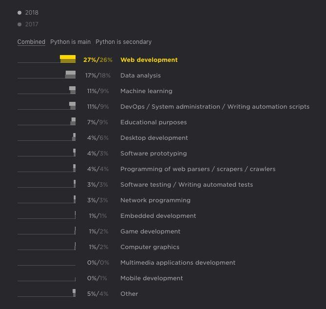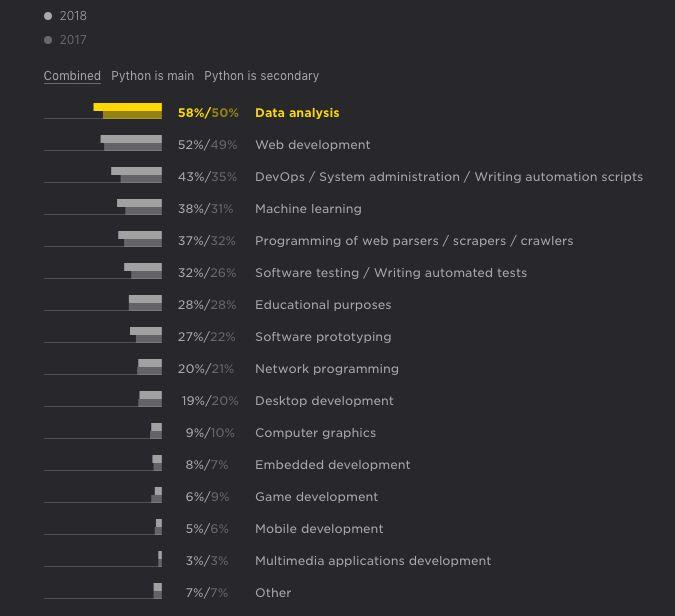 2018 年,使用 Python 做数据分析的用户最多,其次是 web 开发,再次为 DevOps/ 系统管理 / 编写自动化代码、机器学习等。