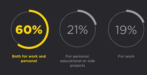 60% 的用户在家和工作中都会使用 Python,21% 的人将之用于个人、教育或辅助项目,19% 用于工作。