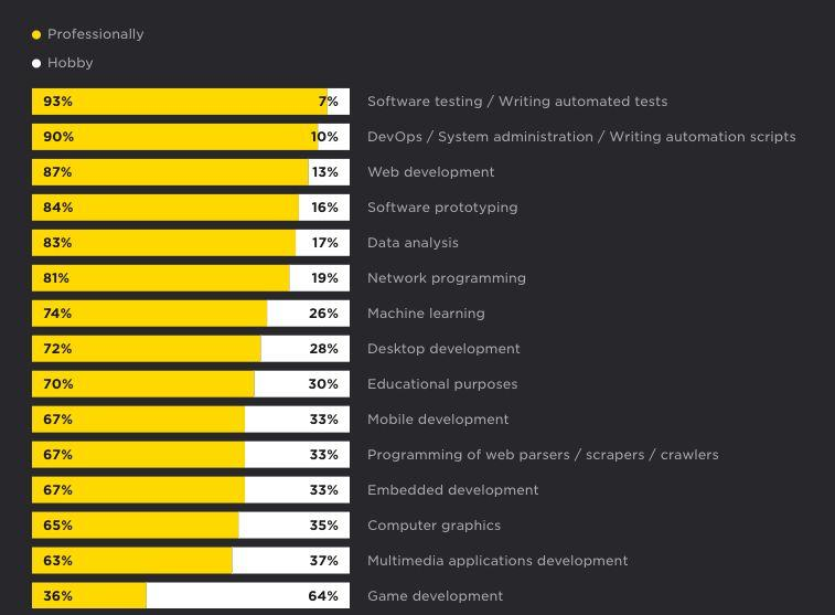 通过这个问题,我们试图更深入地了解受访者在之前的多项选择题中选择的各种开发类型。可以清楚地看到,Python 用于游戏开发主要是业余爱好,而 Web 开发、机器学习、数据分析和软件测试主要是工作所需。