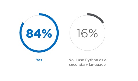 在我们的调查中,84%的 Python 用户使用 Python 作为他们的主要语言,而 16%的用户把 Python 作为第二语言。 在 2017 年,这个分布略有不同:79% 受访者指出他们使用 Python 作为主要语言,21%作为次要语言。