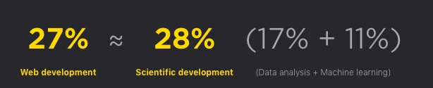 另一个有趣的发现是,只有 82% 主要用于 Web 开发的用户使用 Python 3,而涉及数据科学的 Python 3 采用率上升至 90%。