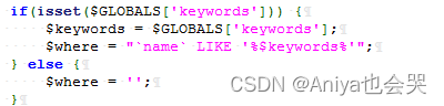 这一部分$keywords 直接被拼接到SQL查询的 WHERE 子句中,没有使用任何参数化查询或转义函数来确保输入的安全。可以构造特定的 $keywords 输入来篡改SQL语句的结构,执行恶意的SQL命令