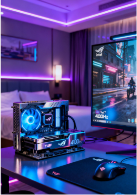 推开电竞酒店的房门,赛博朋克风的灯光立刻勾勒出硬件的轮廓:华硕 TUF 主板上,Intel i7 处理器的散热风扇泛着蓝光,七彩虹 影驰RTX5080显卡的金属背板透着质感,搭配卓威 600Hz 赛事级显示屏和 GPW 4朱雀鼠标,每一处都写着 “顶配” 二字。