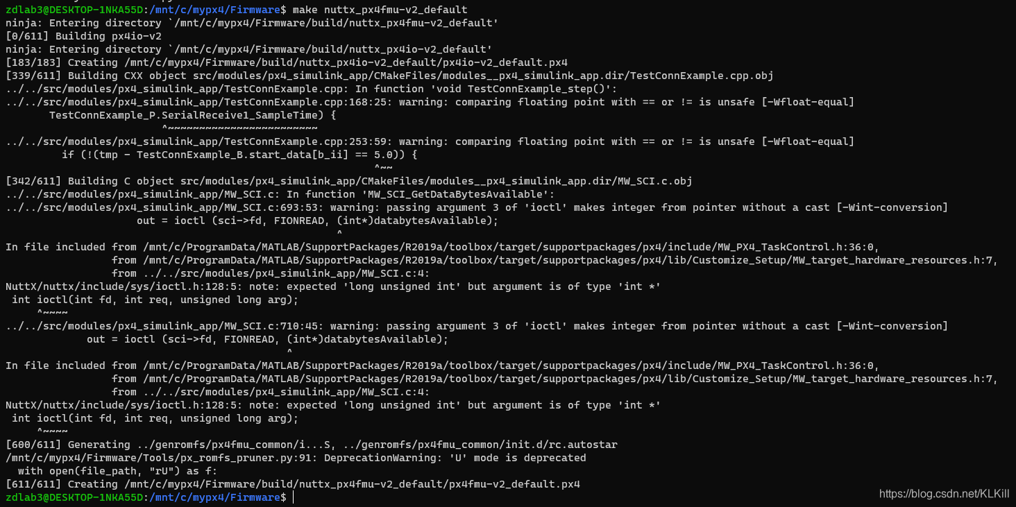 然后建议大家在WSL中build固件,比Matlab命令行窗口可读性强一点,以笔者代码存放位置举例,笔者将PX4固件代码存放在C:\mypx4\Firmware中,正常情况下可以看到Firmware\build文件夹中有两个nuttx开头的文件夹,与Matlab的插件设置Select Cmake Configuration一步中下拉菜单内选项相对应,如果你的情况如上所述,那么执行