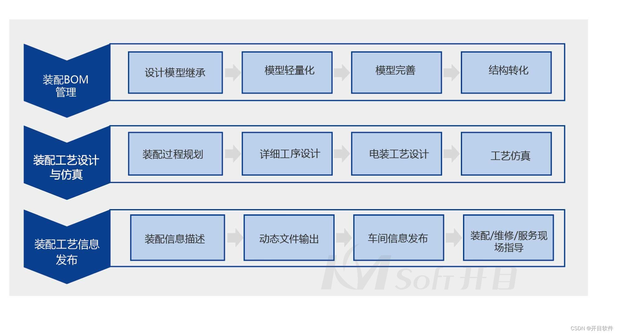 开目3DAST主要功能模块包括设计数据继承和转换、装配结构管理、装配过程规划、详细工序设计、三维布线工艺设计、装配工艺仿真、装配工艺输出等模块。