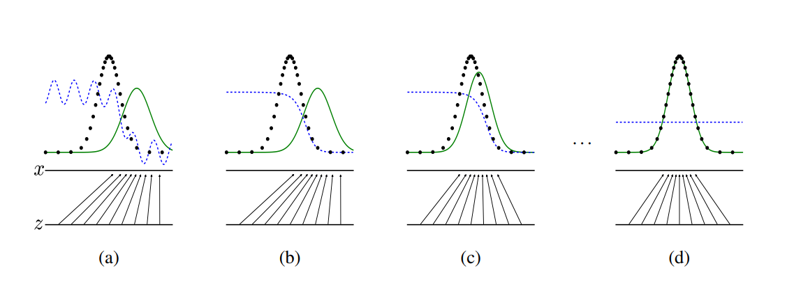算法的流程的形象表示如图2所示:图中绿色指的是生成样本;黑色点指的是真实样本;蓝色虚线指的是判别器;