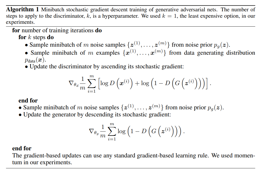 D(x)指的是判别模型;G(z)指的是生成模型;模型的含义是指使得V(D,G)最大的D(x),再使得V(D,G)最小的G(x),一种不断迭代更新生成和判别的算法计算方式。算法如图1所示: