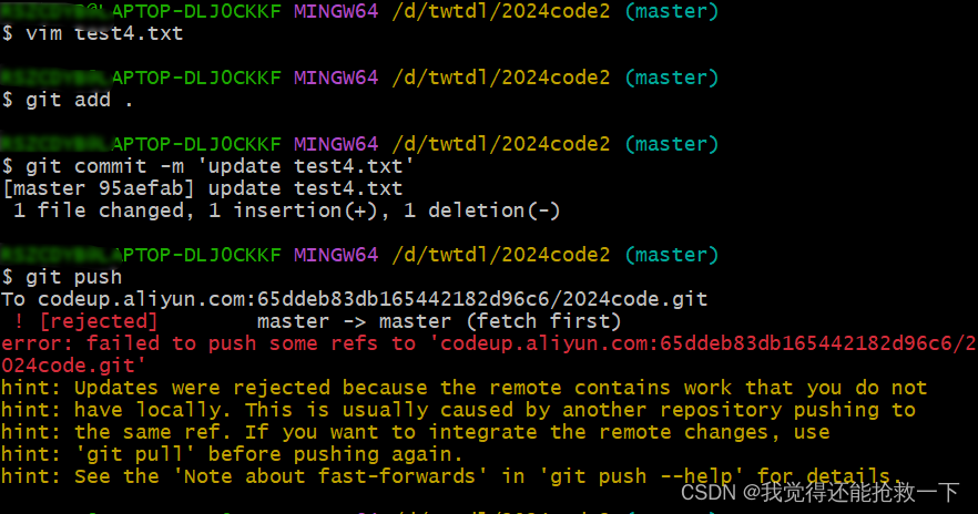 总结一句话就是:先在本地git pull 把冲突给解决掉才能进行push。