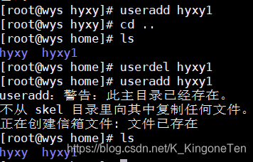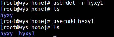 [root@wys home]# userdel -r hyxy1