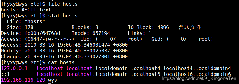 - stat 查看文件的属性,例如文件的名称,大小,权限,时间(atime,ctime,mtime).eg:stat /etc/hosts