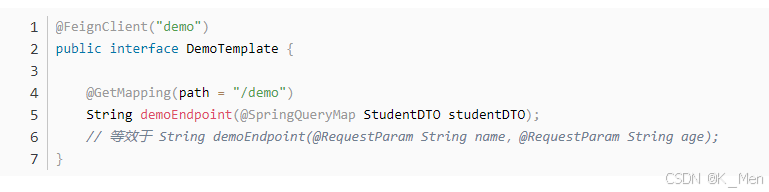 虽然 OpenFeign 的 @QueryMap注解支持将 POJO 映射到 GET 方法的参数上。但由于缺少value属性而与 Spring 不兼容,为此 Spring Cloud OpenFeign 提供了等效的@SpringQueryMap注解,用于将 POJO 或 Map ,映射为 GET 方法的参数。
