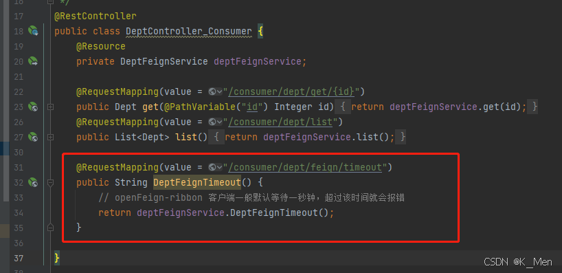 2. 在 micro-service-cloud-consumer-dept-feign 的 DeptFeignService 接口中添加以下代码,绑定服务端刚刚添加的超时服务。