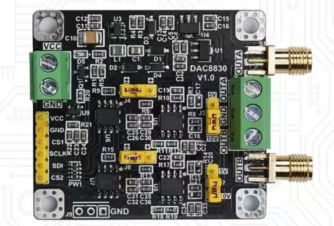 dac8830是一种16分辨率的基于spi通信的dac模块,且spi时钟速率最高50mhz,支持单极性与双极性输出,支持5v和10v两种挡位,制作成电子模块后的样子如下