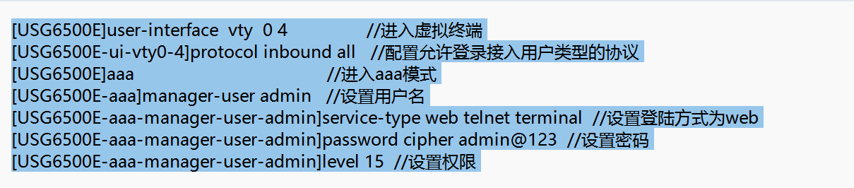 [USG6500E-aaa-manager-user-admin]level 15 //设置权限