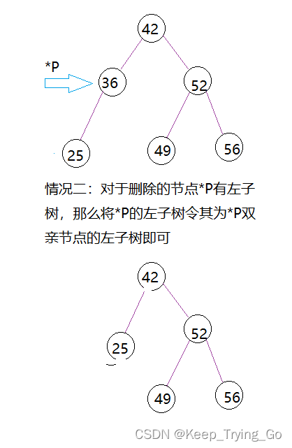 - 如果*P节点只有左子树PL或者右子树PR,那么只需要将PL或者PR为*P双亲*F的左子树或者右子树即可。