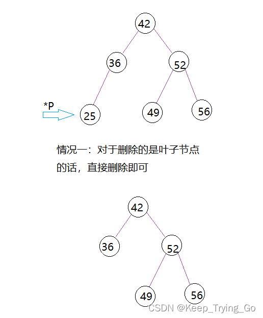 - 如果*P节点为叶子节点,那么其左右子树都是为NULL,也就是删除此节点并不会破坏整棵树的结构,所以直接删除节点*P即可。