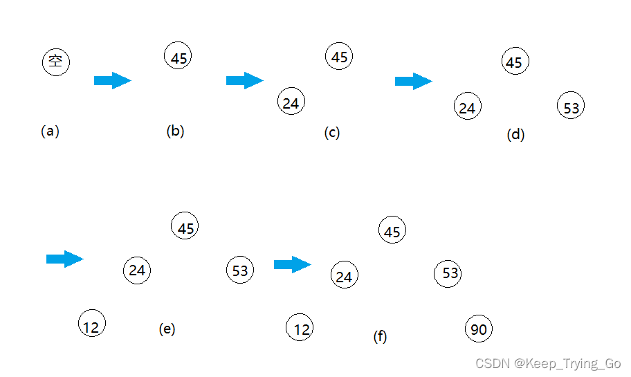 假设:现在有查找的关键字序列为{45,24,53,45,12,24,90},二叉排序树的插入过程如下: