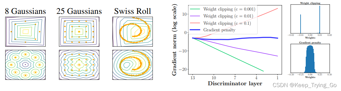 右图:在Swiss Roll数据集上训练期间,深度WGAN critic的梯度范数在使用权重剪裁时爆炸或消失,但在使用梯度惩罚。权重剪裁(顶部)将权重推向两个值(剪裁范围的极端),这与渐变惩罚(底部)不同。可以看到使用权重裁剪(weight clipping[-c,c])时,对去那种的初始化出现了两个极端。然而使用梯度惩罚的话,权重在整个的区间都是呈现一种连续的。