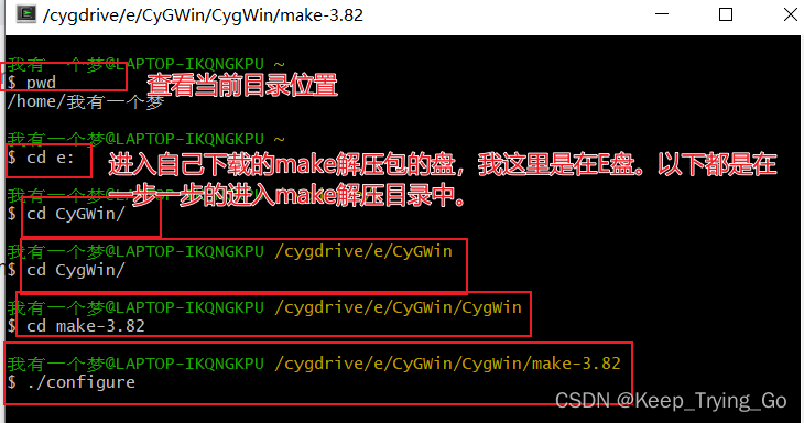 - 打开CygWin,并且进入刚才下载的make解压目录里面;