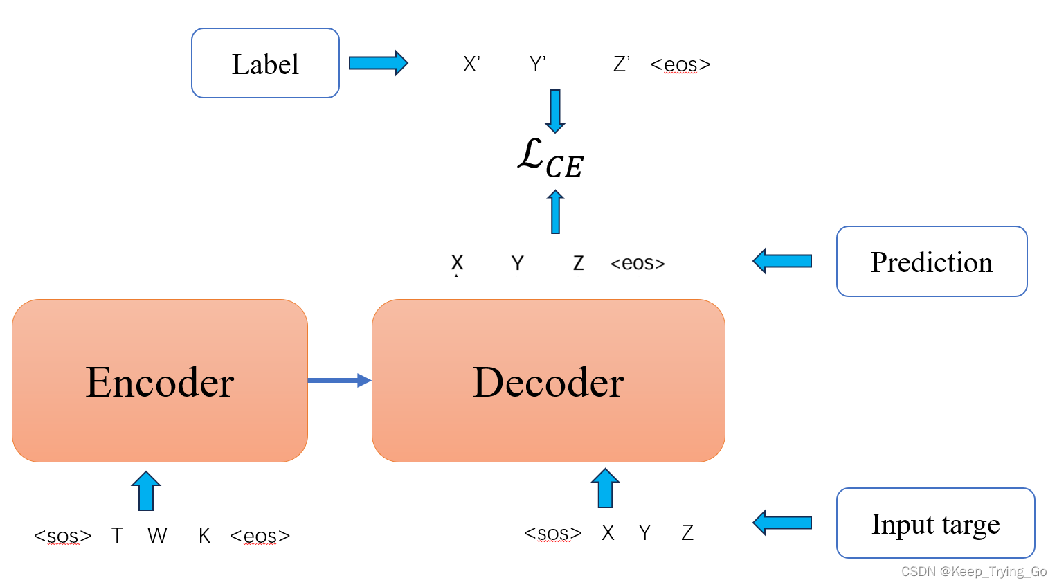 注意看以下两幅图,如果第一幅图看的不是很懂的话,看第二幅图应该很清楚训练的大致流程了,以及输入到编码器,解码器以及对应label应该是什么样的。