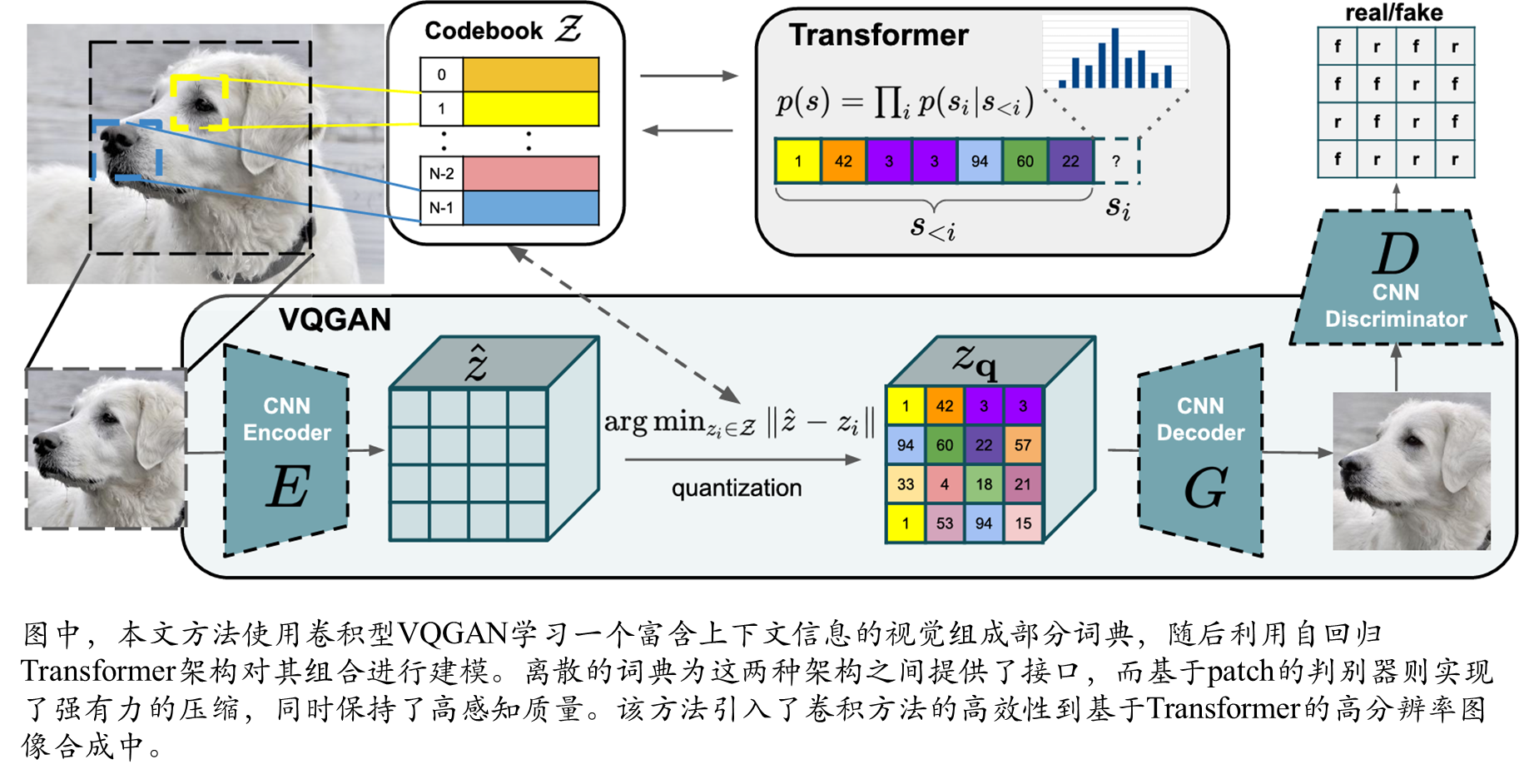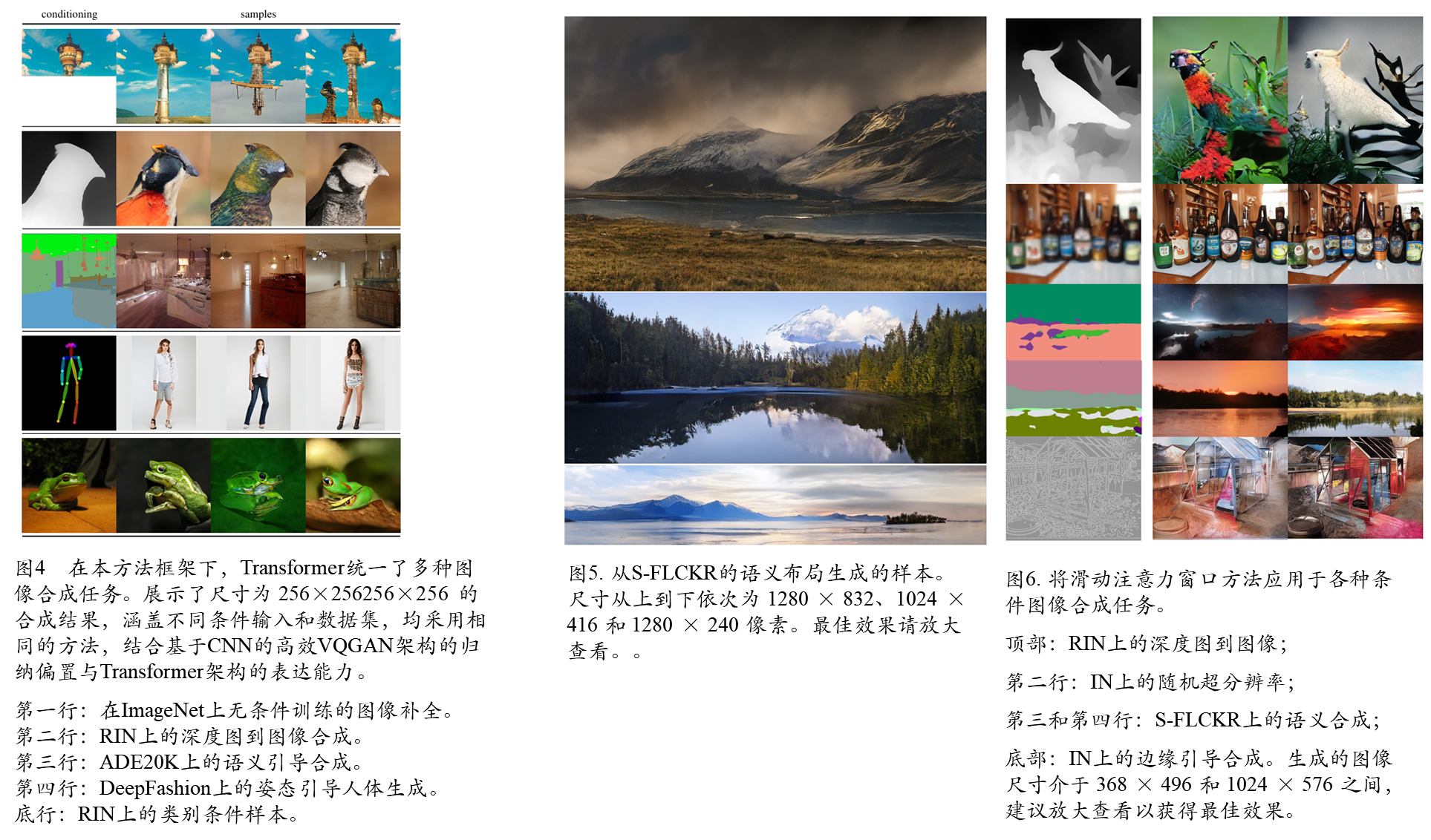 将CNN的归纳偏置优势与Transformer的表达能力相结合,使其能够建模并合成高分辨率图像。具体来说,我们展示了如何(i)利用CNN学习具有丰富上下文信息的图像组成单元词汇,进而(ii)利用Transformer高效地建模它们在高分辨率图像中的组合方式。我们的方法可以直接应用于条件合成任务,其中非空间信息(如物体类别)和空间信息(如分割图)都能控制生成的图像.