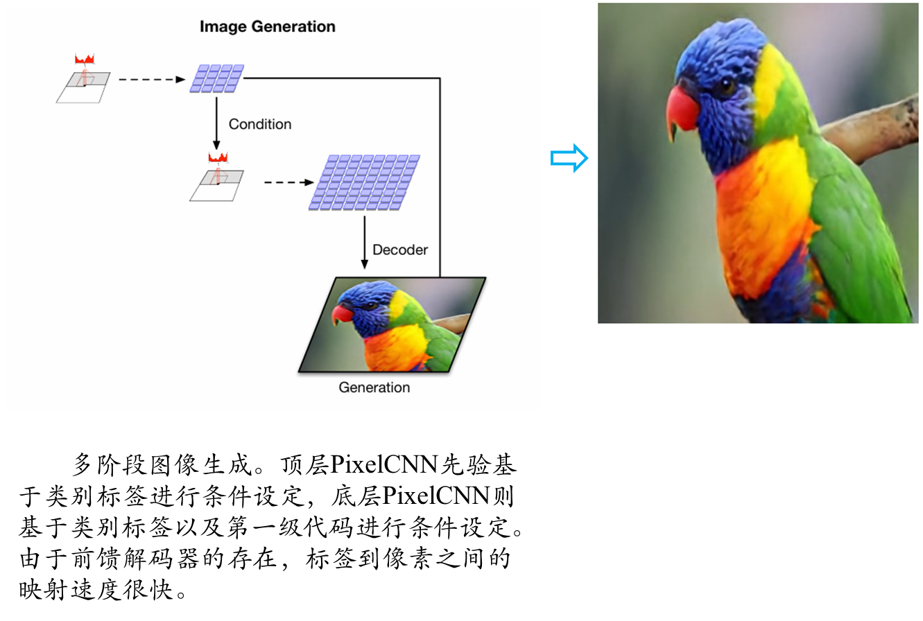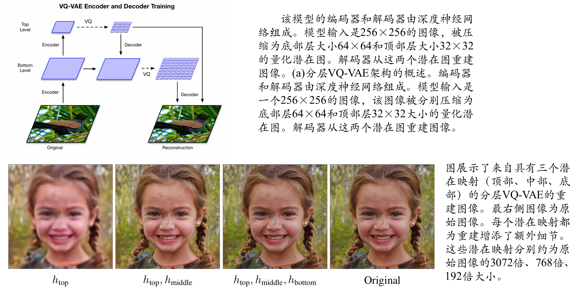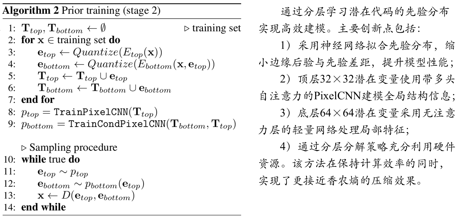高效采样:采用PixelCNN + 自注意力(PixelSnail)建模隐空间先验,采样速度提升30倍,适用于高分辨率图像生成。