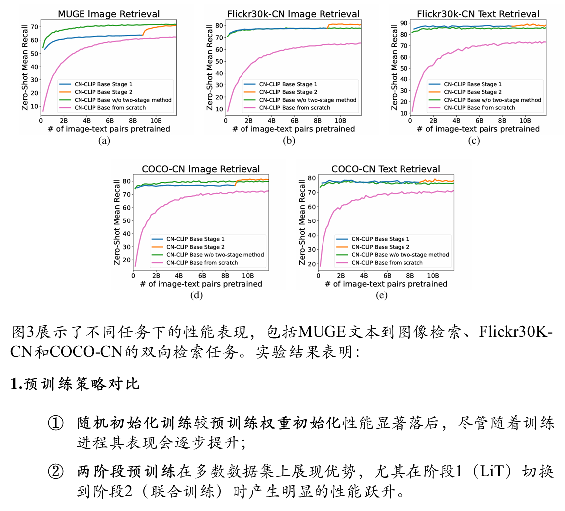 本文认为双编码器必须学习语言原生的视觉-文本数据分布是取得突破的关键。其次,现有中文多模态预训练方法的性能受制于多重因素:从头预训练需要构建类似Web Image Text(WIT)的大规模高质量中文图文对数据集。虽然通过CLIP初始化与锁定图像调优(Locked-Image Tuning)可实现快速迁移,但视觉编码器仍难以学习语言特定域的图像特征。