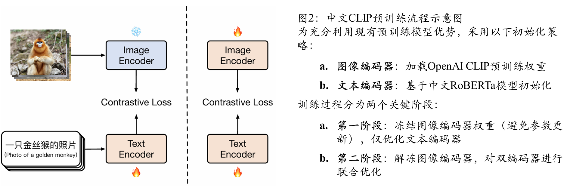 提出中文CLIP——基于公开中文图文对数据预训练的语言专用视觉-语言基础模型。在架构上保持与OpenAI CLIP的一致性,但创新性地开发了两阶段预训练方法: