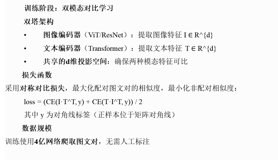 | 训练目标 | 单模态监督学习 | 跨模态自监督对比学习 |