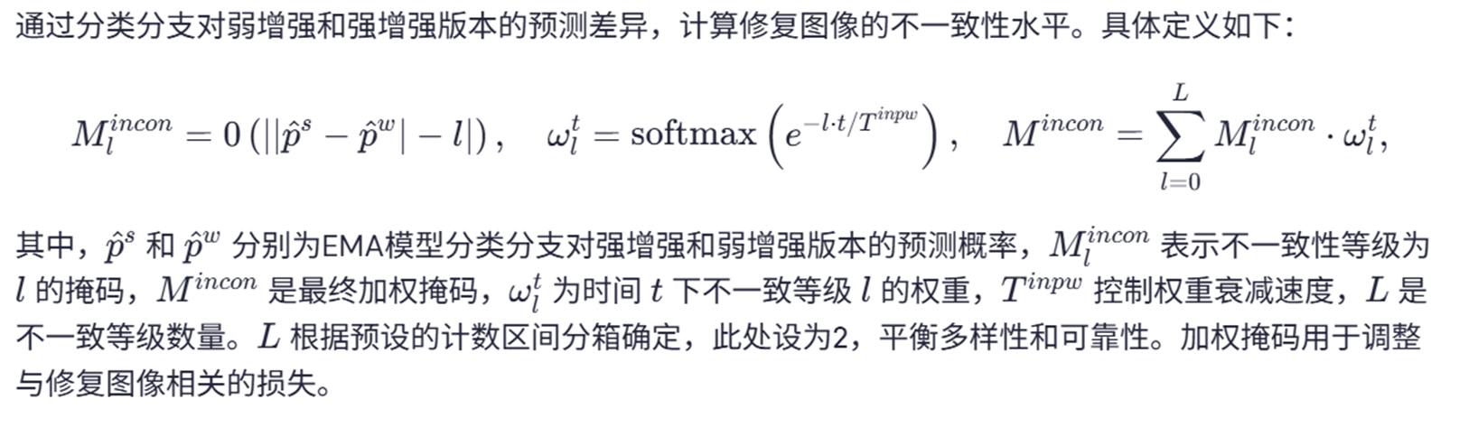图2. TMTB方法的整体框架。该框架包含用于半监督学习的Mean Teacher结构、以VSSM为主干网络、用于预测掩码的分类分支以及用于修复增强的图像修复模块。修复过程会周期性执行,生成或更新修复后的图像。为过滤不可靠区域,教师模型根据修复图像的不一致性程度生成加权掩码,该掩码将应用于Linp。