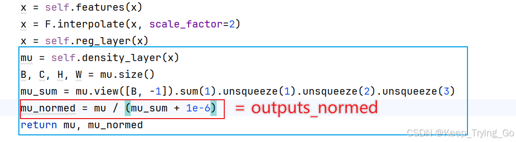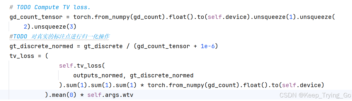 注:这里的代码实现和公式是对应的,并且其中的输出密度图和真实标注点都是经过归一化之后的,其中gd_count_tensor表示人群头部点标注信息,gt_discrete表示将人群头部的二维坐标点映射到一维表示的结果。